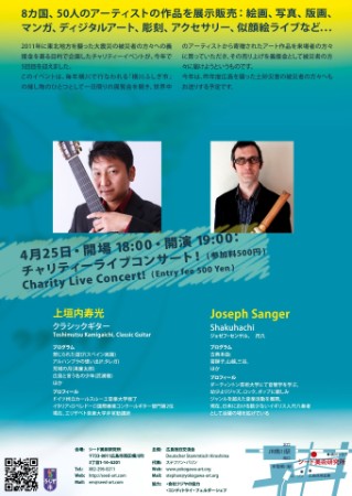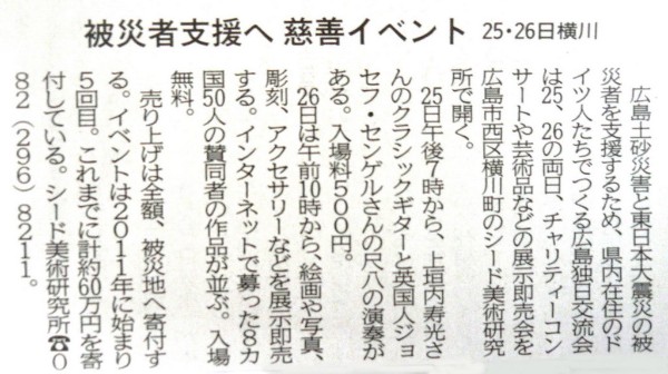 私どもは過去4年にわたり、横川ふしぎ市に於いて、東日本大震災の被災者支援の目的で、世界中のアーティストが寄贈したオリジナルの美術作品を展示即売するチャリティーイベントを開催してきました。第5回目となる今年は、昨年度広島を襲った土砂災害の被災者の方々へも売り上げの一部をお送りする予定です。